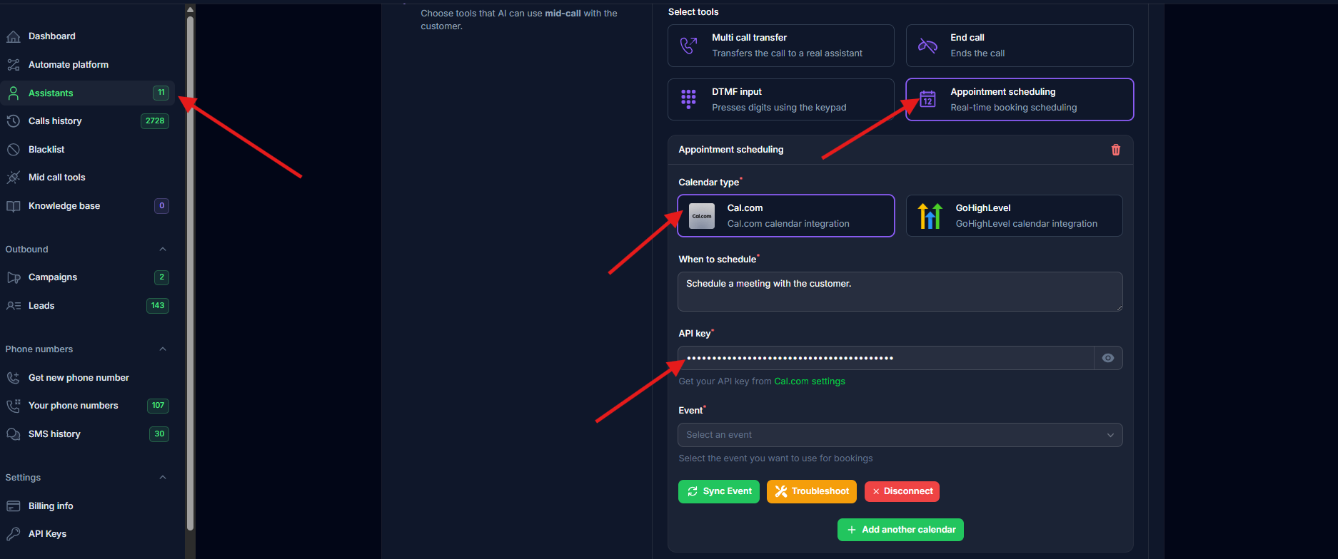 1. In your assistant settings → Tools tab → Appointment Scheduling