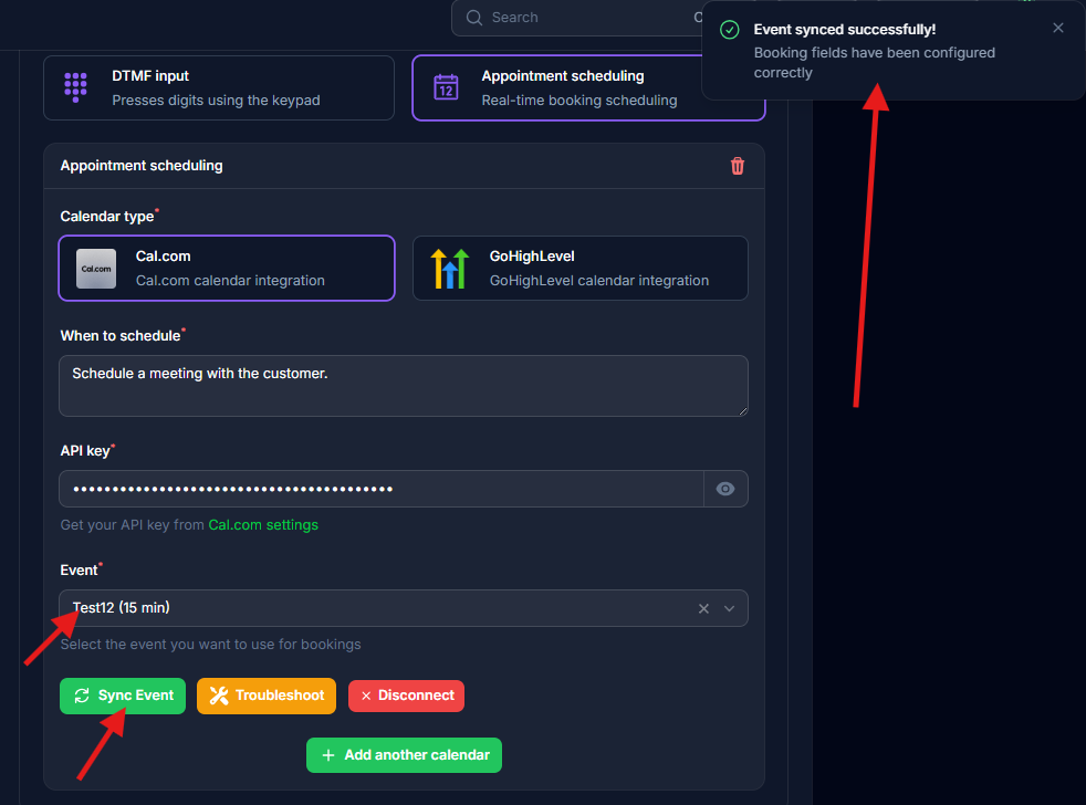 Enable your AI assistant to schedule meetings using Cal.com integration. The system automatically configures booking fields for you.